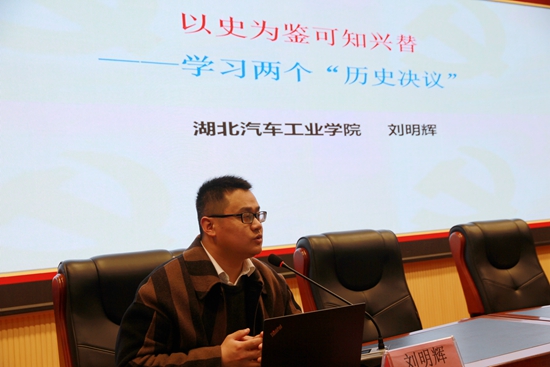 本网讯(文 杜鹏/图 杜剑彬)4月13日下午,学校党史学习教育主题读书班专题辅导讲座第三讲暨明德论坛第四十讲在逸夫报告厅开讲。十堰市委宣讲团成员、我校马克思主义学院思政课部主任刘明辉老师应邀作了“以史为鉴可知兴替---学习两个‘历史决议’”主题讲座。党委书记程红兵主持讲座,学校副处级及以上干部、党支部书记聆听了讲座。