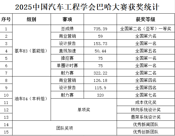 本网讯(文/孙国兴、邹春龙)近日,2025中国汽车工程学会巴哈(越野车)大赛在浙江湖州落幕。本次赛事吸引全国115支车队、近2000名学子同台竞技,我校汽车智能制造学院飞翼车队携氢能巴哈赛车H3、燃油巴哈赛车U4参赛,最终斩获氢能组全国总成绩亚军(一等奖)、燃油组二等奖的优异成绩。